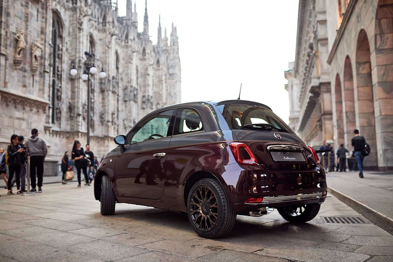 Disegnata dal Centro Stile Fiat, la nuova 500 Collezione succede alla serie speciale concepita per la stagione primaverile, assecondando le stagioni della moda con una nuova proposta capace di conquistare chiunque desideri distinguersi con classe, gli amanti dell’estetica ricercata e dello stile senza tempo. Una clientela moderna e connessa, che vive appieno la cultura e la socialità urbana. È disponibile sia come berlina con tetto in vetro di serie, sia in versione cabrio con soft top grigio, e sfoggia livree uniche e inedite, come il bicolore “Brunello”, abbinamento a contrasto tra Bordeaux Opera e Grigio Carrara. Sia all’interno sia all’esterno spiccano dettagli color rame, dal cruscotto alla linea di bellezza per arrivare ai cerchi in lega da 16”, contenuti esclusivi, interni preziosi in tessuto gessato e, a siglare l’eleganza della vettura il logo “Collezione” cromato in corsivo, sul portellone posteriore.