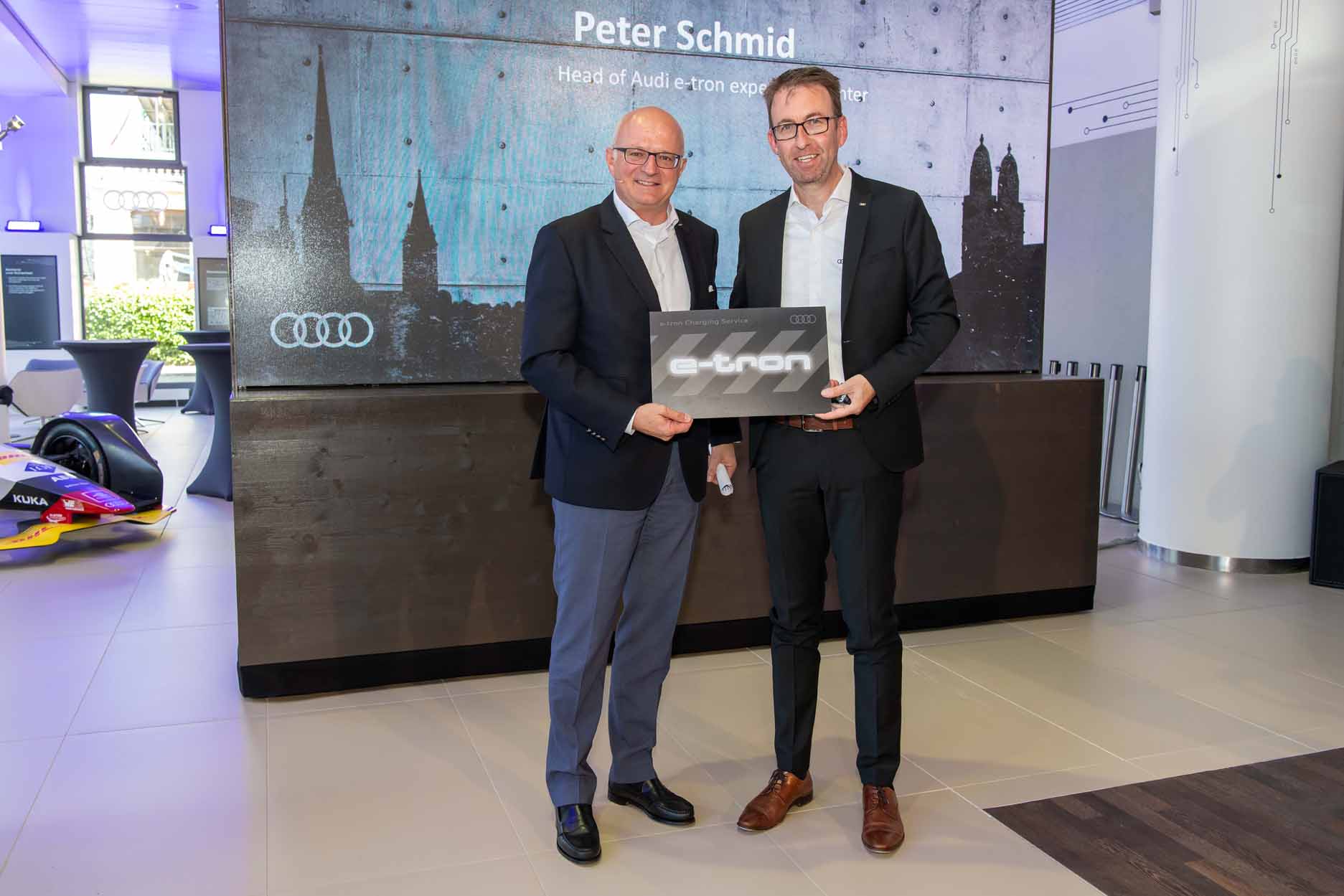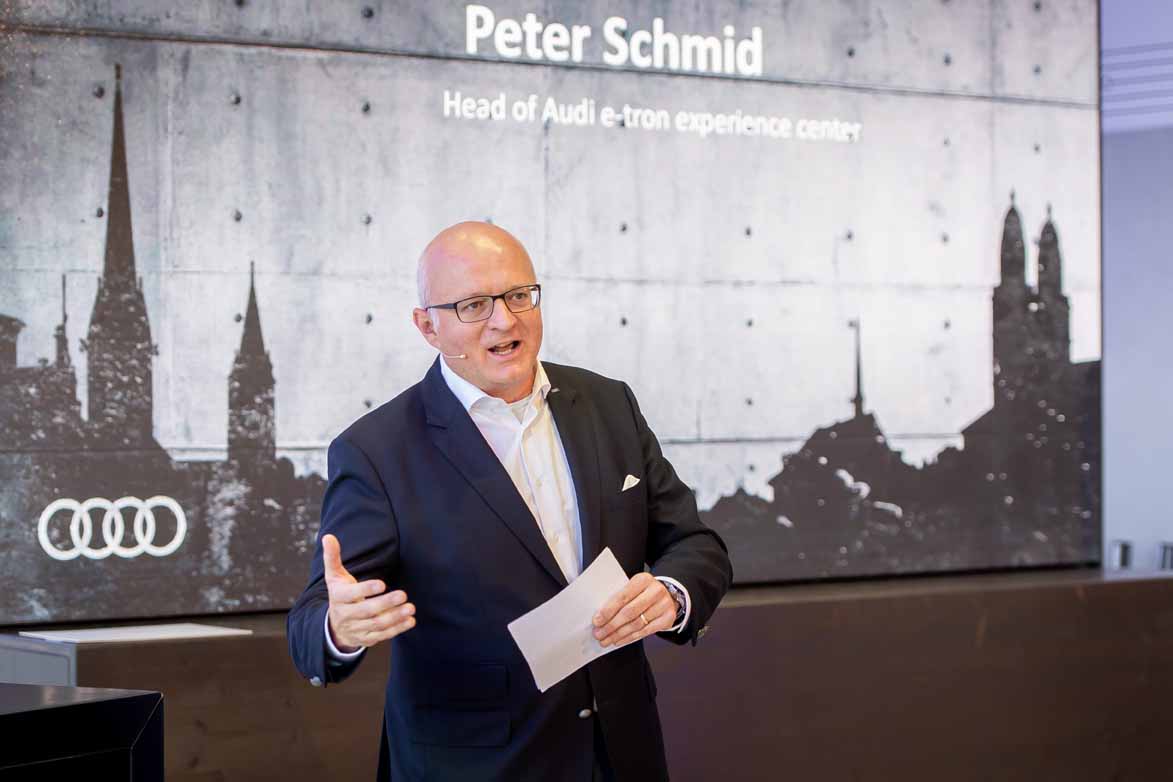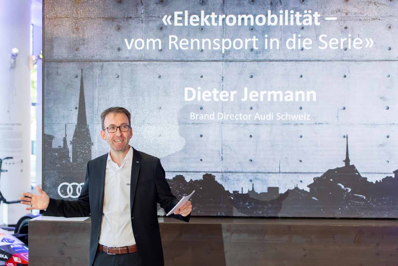 All’inaugurazione del nuovo “Audi e-tron experience center”, Dieter Jerman, Brand Director di Audi Svizzera, ha svelato le ultime novità e-tron, i programmi del centro di competenza Audi in tema mobilità elettrica e il team Audi Sport Abt Schaeffeler, che parteciperà il 22 giugno 2019 alla prima gara di Formula E nella capitale. Il direttore di Audi Svizzera ha aperto la conferenza informando sulle strategie di elettrificazione del marchio. Martin Sorge, del centro sviluppo motori Audi e-tron di Audi AG, Dieter Gass, responsabile di Audi Motorsport e il pilota Daniel Abt sono stati intervistati sull’evoluzione dell’elettro mobilità da Sven Epiney, SRF.
