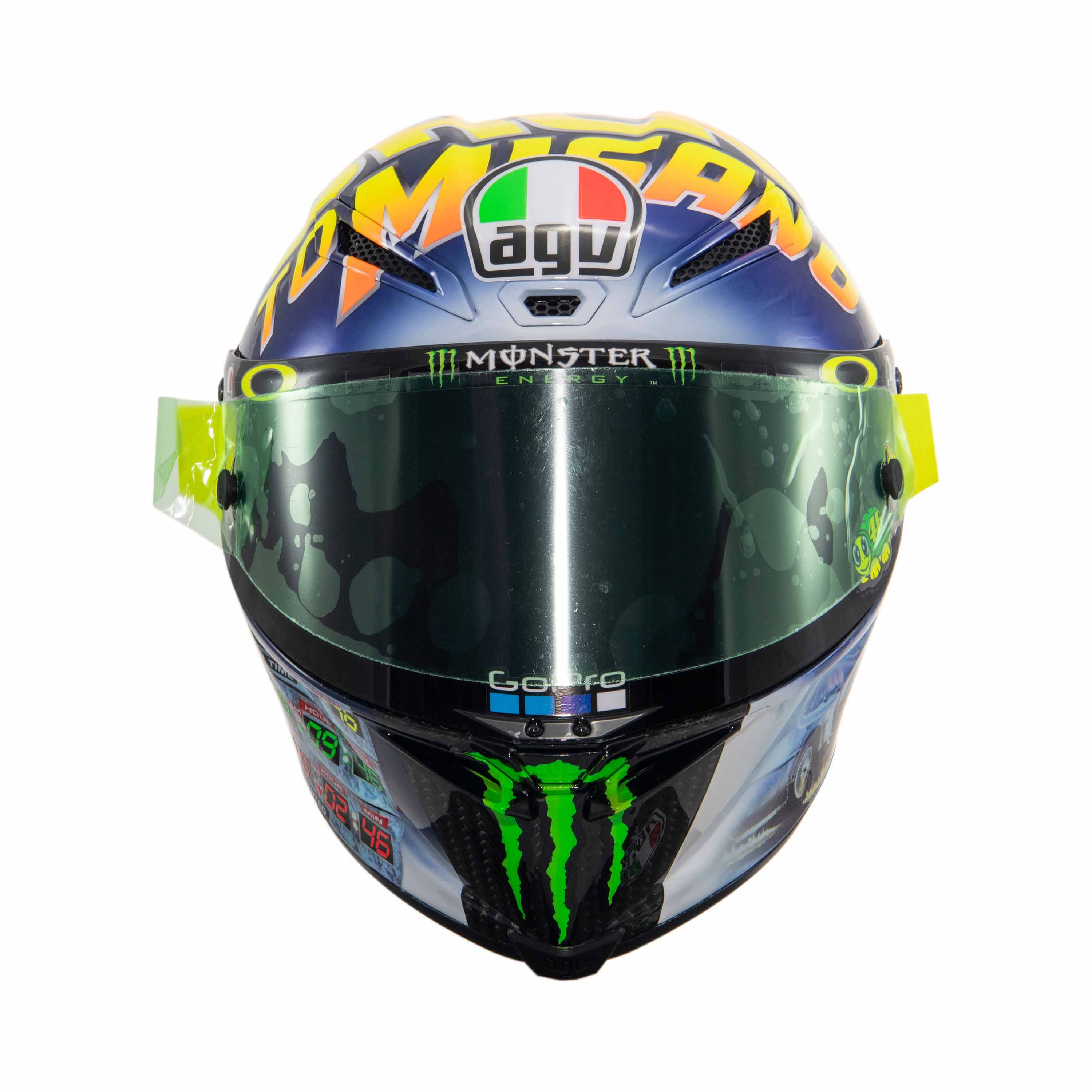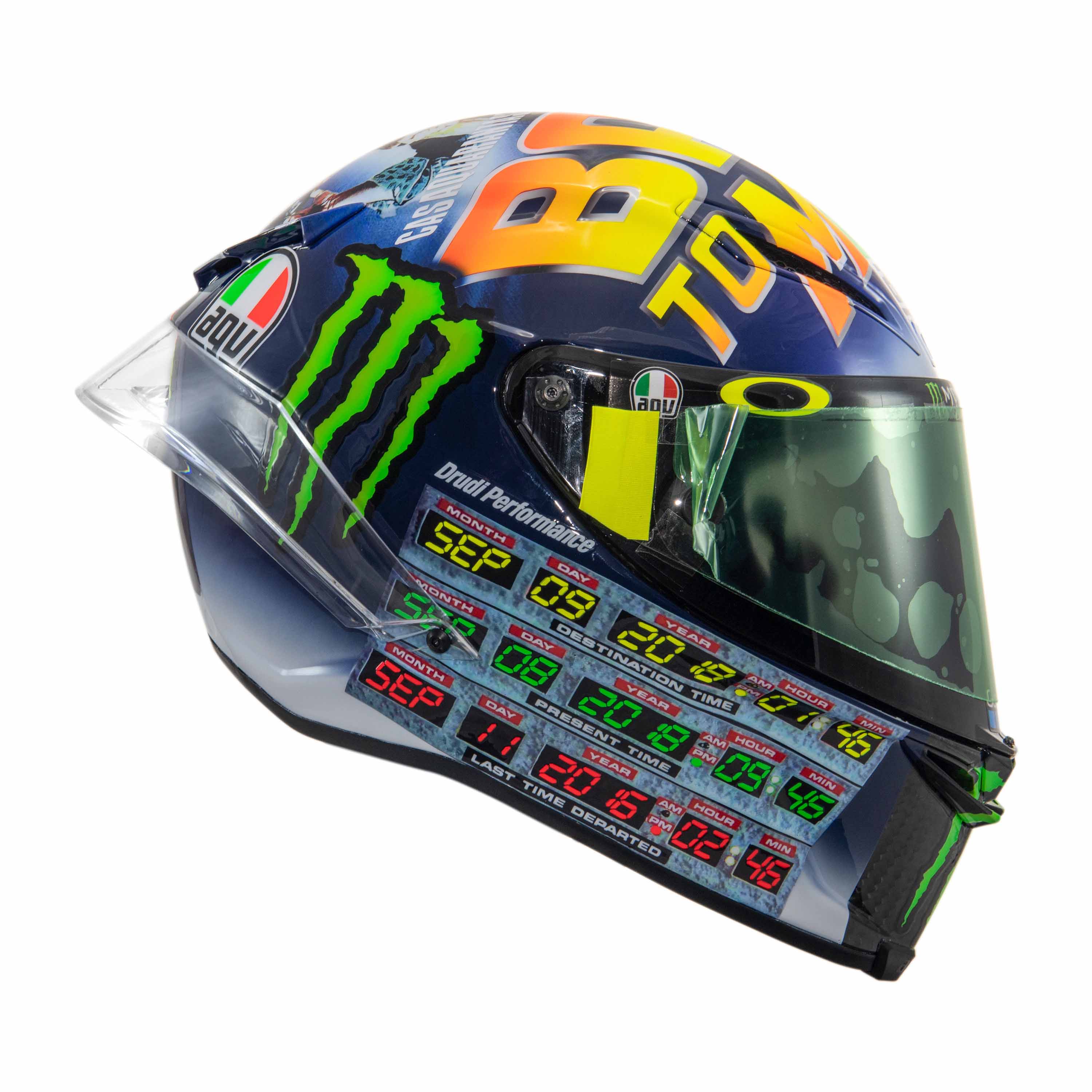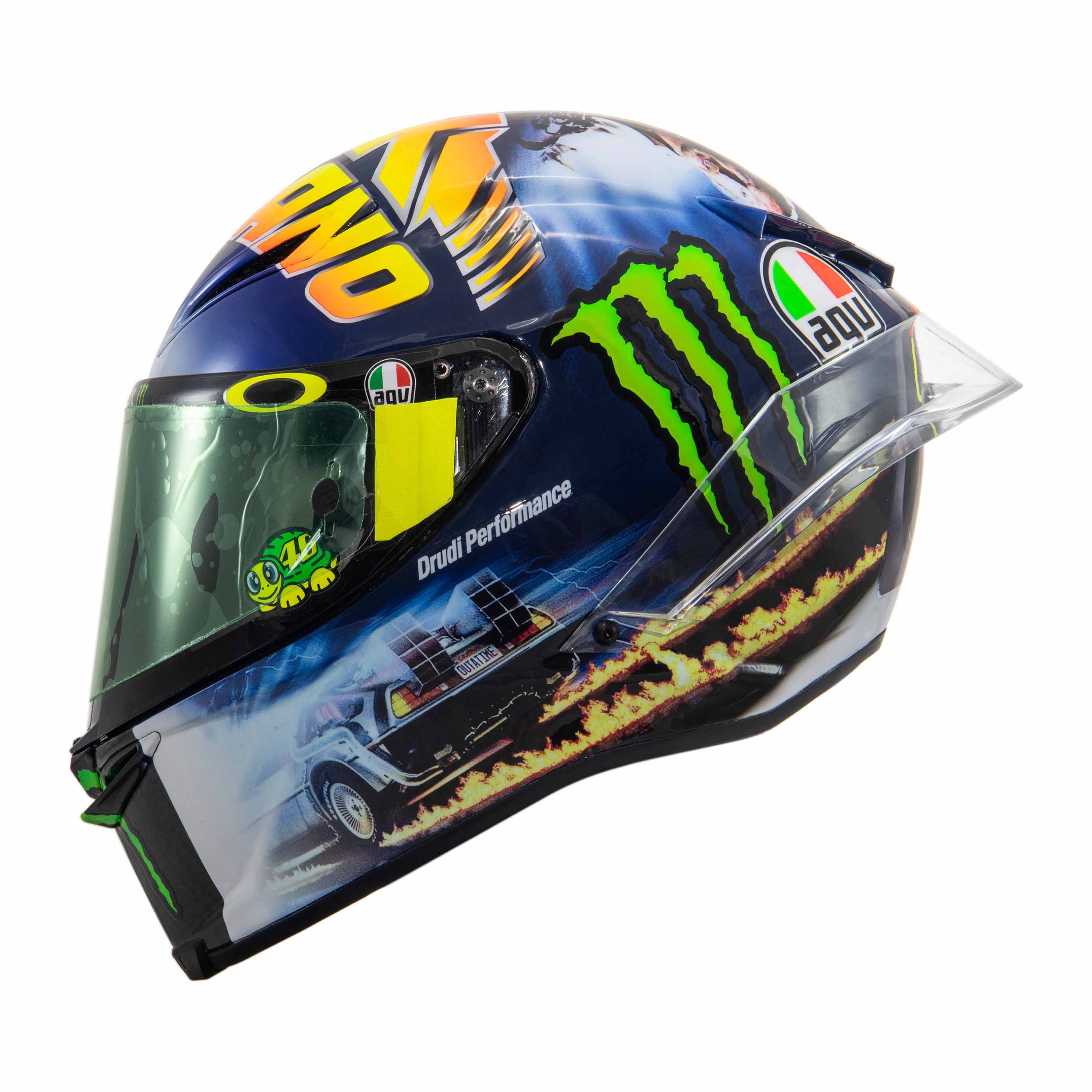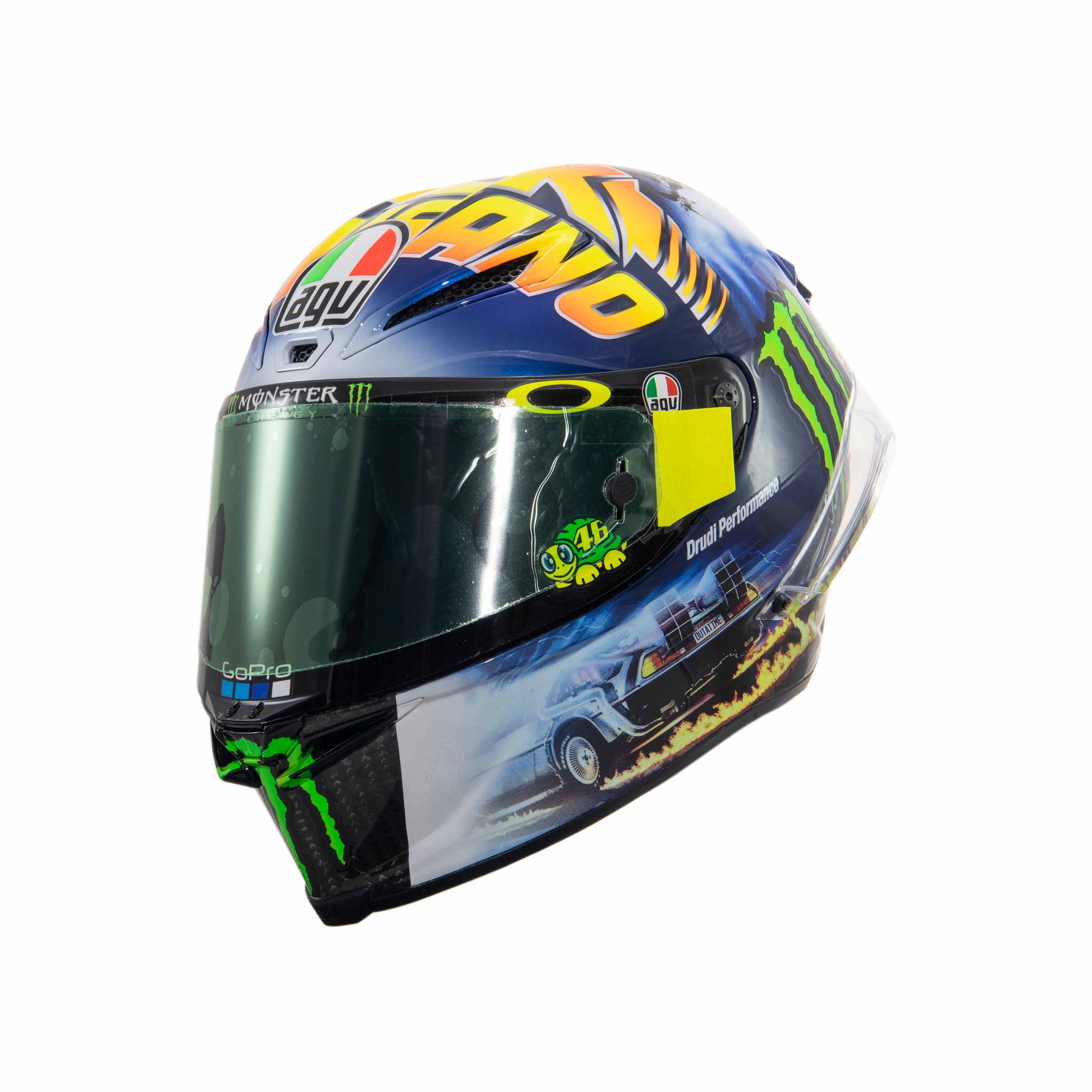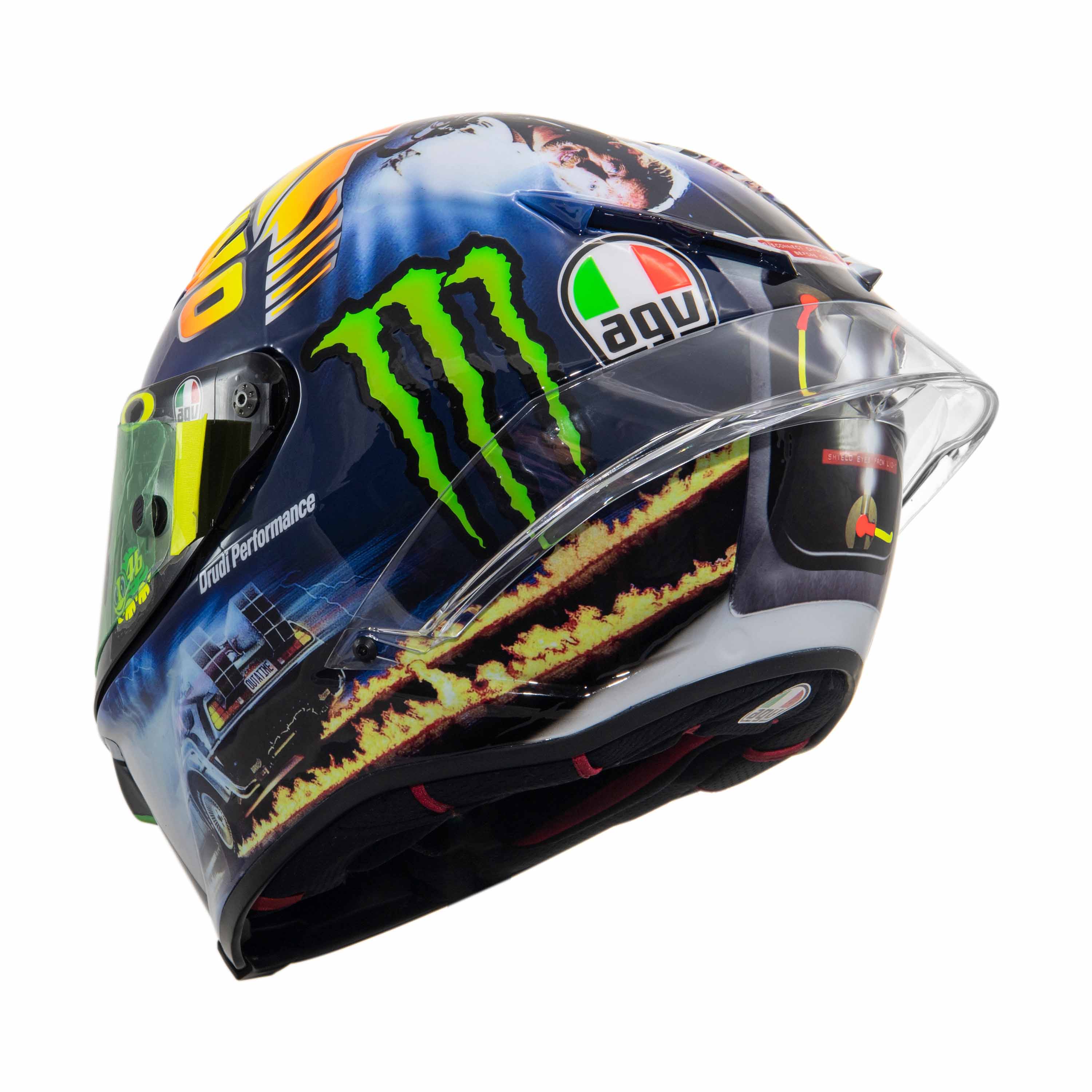 Non mancano i riferimenti al film, quali il pannello sul lato destro del casco riportante la data dell’ultima apparizione di Valentino a Misano e la data corrente. Sul lato sinistro fa mostra di sé la Delorean, auto che permetteva ai protagonisti di viaggiare nel tempo grazie al flusso canalizzatore, rappresentato sul retro del Pista GP R.