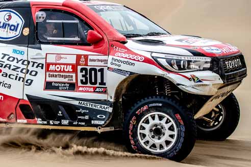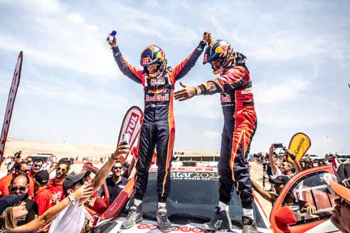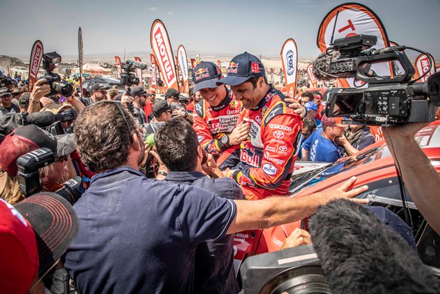 La fase finale della Dakar 2019 si è svolta al bivacco di Pisco e ha visto Nasser Al Attiyah e Mathieu Baumel della squadra sudafricana Toyota Gazoo Racing SA portare a casa una vittoria storica con la loro Toyota Hilux. Prima vittoria per Toyota, ma anche della prima auto a benzina a vincere nell’era sudamericana della Dakar. Terzo trionfo invece per il pilota del Qatar Nasser Al Attiyah.