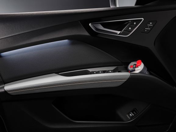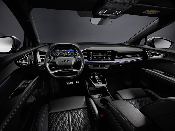 Futuristica la nuova generazione di volante con comandi touch. In termini di vani porta oggetti, la Q4 e-tron, con circa 25 litri di volume totale marca nuovi parametri, con portabottiglie nella parte superiore delle porte. Il design interno, arioso e progressivo, dà vita a una nuova era tecnologica.