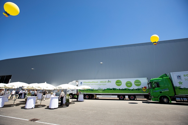 Als besonderes Highlight hat Lidl Schweiz die Tankstelle als Demonstrationsprojekt mit fossilfreiem flüssigem Biogas (LBG) eröffnet. Damit beweist Lidl Schweiz, dass es bereits heute technisch und logistisch möglich ist, Transporte im Schwerlastverkehr fossilfrei betreiben zu können.