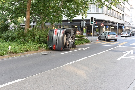 Gegen 19.00 Uhr fuhren zwei Personenwagen parallel zueinander auf der Sihlstrasse von der Sihlporte her in Richtung Bahnhofstrasse. Kurz vor der Verzweigung mit der Nüschelerstrasse kam es zur Kollision, bei der das auf der linken Spur fahrende Fahrzeug umkippte. Der 39-jährige Lenker verletzte sich beim Aussteigen aus dem gekippten Fahrzeug leicht an der Hand. Die 20-jährige Lenkerin des anderen Fahrzeuges blieb unverletzt.