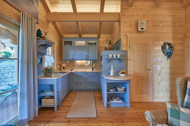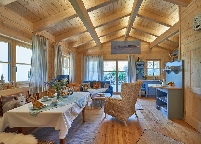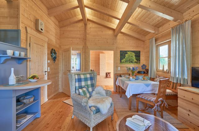 Neben den vier Ferienwohnungen des Ehepaares sorgt das maßgefertigte Chalet von Blockhausbau Hummel aus Ottobeuren für ein Plus an Ruhe, Abgeschiedenheit und Blockhaus-Romantik. Gäste, die dem Alltagstrubel entfliehen und die Seele baumeln lassen wollen, sind in dem rund 60 m2 großen Gebäude des Allgäuer Gartenhausspezialisten genau richtig: Es bietet nicht nur vier Schlafplätze, ein Bad und einen geräumigen Wohnraum mit offener Küche, sondern auch eine große Terrasse mit Blick in die Natur.