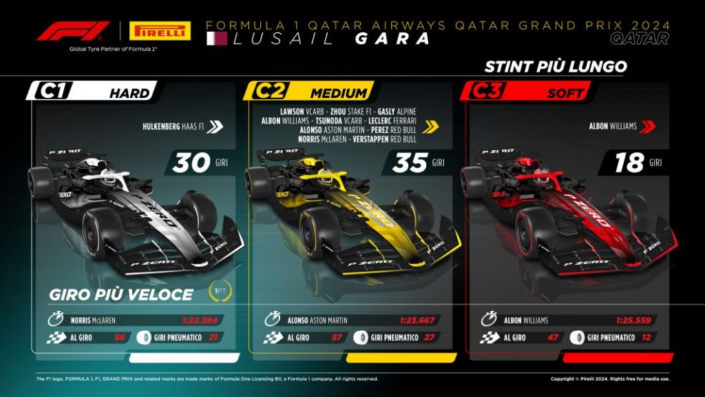 Per il resto, il livello di prestazione delle mescole più utilizzate, C1 e C2, è stato molto simile e, come detto in precedenza, con un degrado veramente limitato. Di conseguenza, il livello di gestione degli pneumatici è stato praticamente nullo, coi piloti che hanno potuto spingere a loro piacimento, pur avendo scelto – nei fatti – la strategia ad una sola sosta”. MARIO ISOLA – DIRETTORE MOTORSPORT PIRELLI