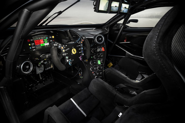Gli interni sono stati mantenuti il più possibile essenziali e simili a quelli della 488 GT3 Evo 2020, con l’eccezione di pannelli porta e finizioni della plancia lato passeggero. I sedili specifici, sellati in Alcantara® con logo elettrosaldato, donano all’abitacolo un look elegante, perfettamente integrato con quello degli esterni. La visibilità posteriore è garantita da un sistema di videocamere che ha apportato grandi vantaggi dal punto di vista aerodinamico grazie alla rimozione dei classici retrovisori, oltre a preservare le linee della fiancata.