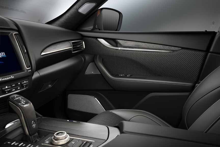 L’inconfondibile design del Levante raggiunge in questo modello nuove vette di sportività come lo splitter inferiore, le mostrine delle prese d’aria anteriori, le minigonne laterali e l’estrattore posteriore, realizzati in fibra di carbonio laccata ultraleggera. Il frontale del Levante Trofeo presenta la calandra con doppi listelli verticali in finitura Black Piano, fascia inferiore a nido d’ape, maniglie porta in tinta vettura, e pinze freno ad alte prestazioni disponibili nei colori rosso, blu, nero, argento o giallo. Completa l’estetica da coupé del Levante, il tipico logo Trofeo “Saetta” montato sull’iconico montante posteriore. L’abitacolo del Levante Trofeo è un concentrato di soluzioni eleganti pensate ad arte per creare un ambiente esclusivo. Il “Pieno Fiore” è una pelle che non ha eguali nell’industria automobilistica, grazie alla sua naturale morbidezza al tatto e alle inimitabili caratteristiche che sviluppa nel corso degli anni.