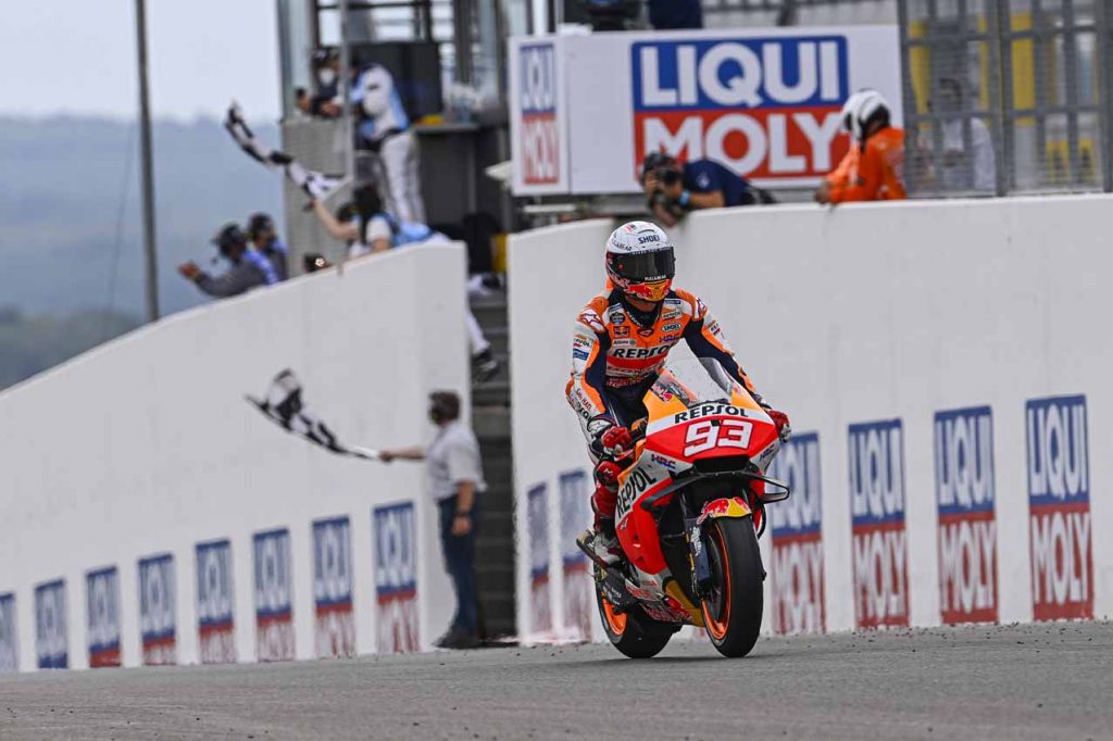Il numero 93 ha resistito alla sempre più crescente pressione di Miguel Oliveira (Red Bull KTM Factory Racing) per ottenere la sua 11ma vittoria di fila al Sachsenring.