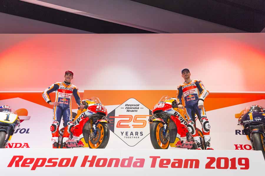 I due campioni del mondo hanno svelato, mercoledì 23 gennaio nel quartier generale della Repsol a Madrid, la livrea con la quale inseguiranno il titolo iridato 2019. Dopo aver vinto otto degli ultimi nove mondiali nella classe regina, Marc e Jorge , uniscono le forze in una squadra perfetta per celebrare il 25 ° anniversario dell’HRC e della Repsol.