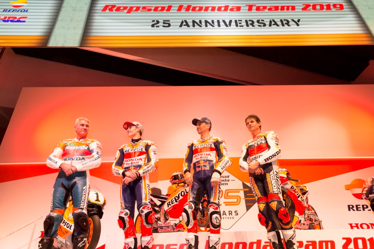 I primi a correre con gli iconici colori, Mick Doohan e Alex Crivillé, sono stati della partita e hanno condiviso ricordi e vittorie dal 1995 in poi. I piloti sono stati raggiunti sul palco da Tetsuhiro Kuwata, direttore Honda Racing Corporation (HRC) e Antonio Brufau, CEO di Repsol, entrambi hanno sottolineato i loro piani per continuare sulla via del successo. Presenti anche Carmelo Ezpleta, CEO di Dorna e Begoña Elices, direttore generale delle comunicazioni e membro del consiglio di amministrazione di Repsol.