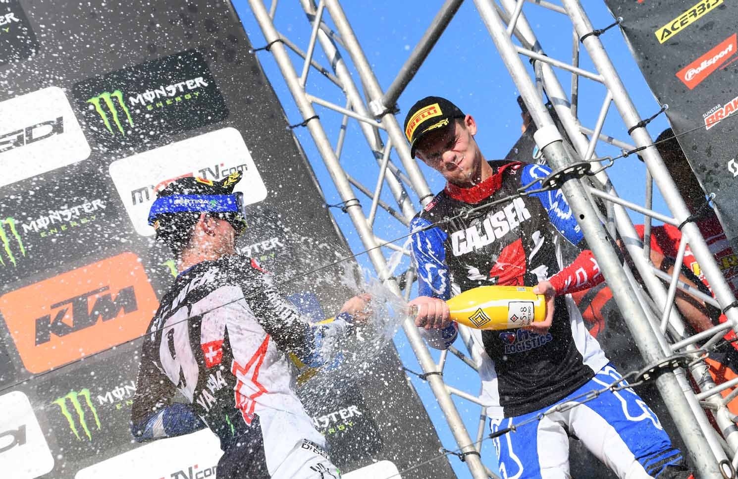 Jorge Prado è stato ancora una volta inarrivabile nella MX2. Lo spagnolo ha vinto, dominando, entrambe le manche e potrebbe festeggiare in Svezia il secondo titolo consecutivo nella classe minore. Thomas Kjer Olsen, unico pilota ancora in grado di giocarsi il Campionato con Prado, ha chiuso in seconda posizione. Buona performance anche per Calvin Vlaanderen che ha terminato al quinto posto nell’assoluta di giornata.