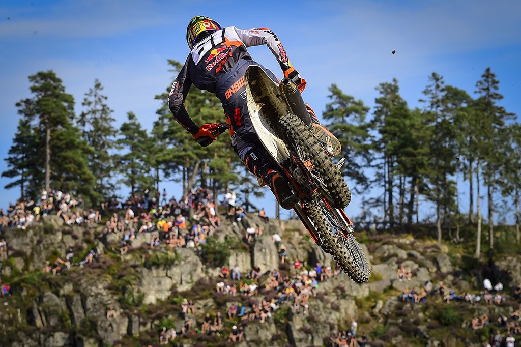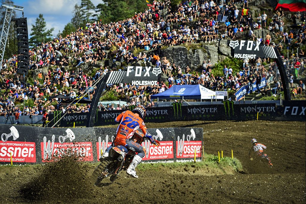 UDDEVALLA (Svezia) 25 agosto 2019 – Con il sole e una grande folla presente sul ben preparato circuito di Uddevalla, si è corso un altro sensazionale weekend di mondiale motocross. Jorge Prado della Red Bull KTM Factory Racing ha conquistato il suo secondo titolo mondiale nella classe MX2 e due sorprendenti vincitori sono saliti sul podio nelle classi MXGP e MX2. Glenn Coldenhoff della Standing Construct KTM ha vinto il suo secondo GP stagionale in MXGP e Tom Vialle della Red Bull KTM Factory Racing con una bella 2-2 ha colto la vittoria complessiva in MX2.