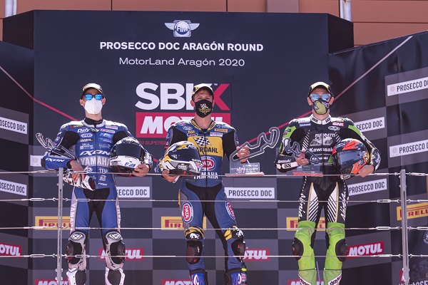 In WorldSSP Gara 1, seguono sul podio Jules Cluzel (GMT94 Yamaha / Yamaha YZF R6) e Philipp Oettl (Kawasaki Puccetti Racing / Kawasaki ZX-6R).